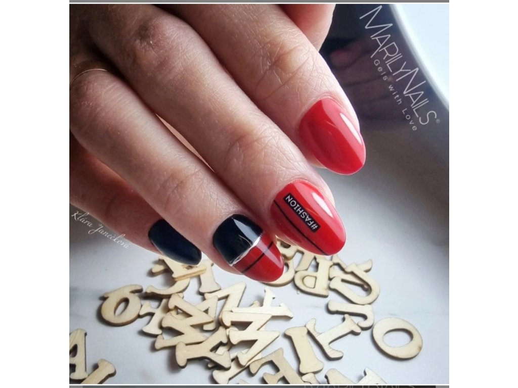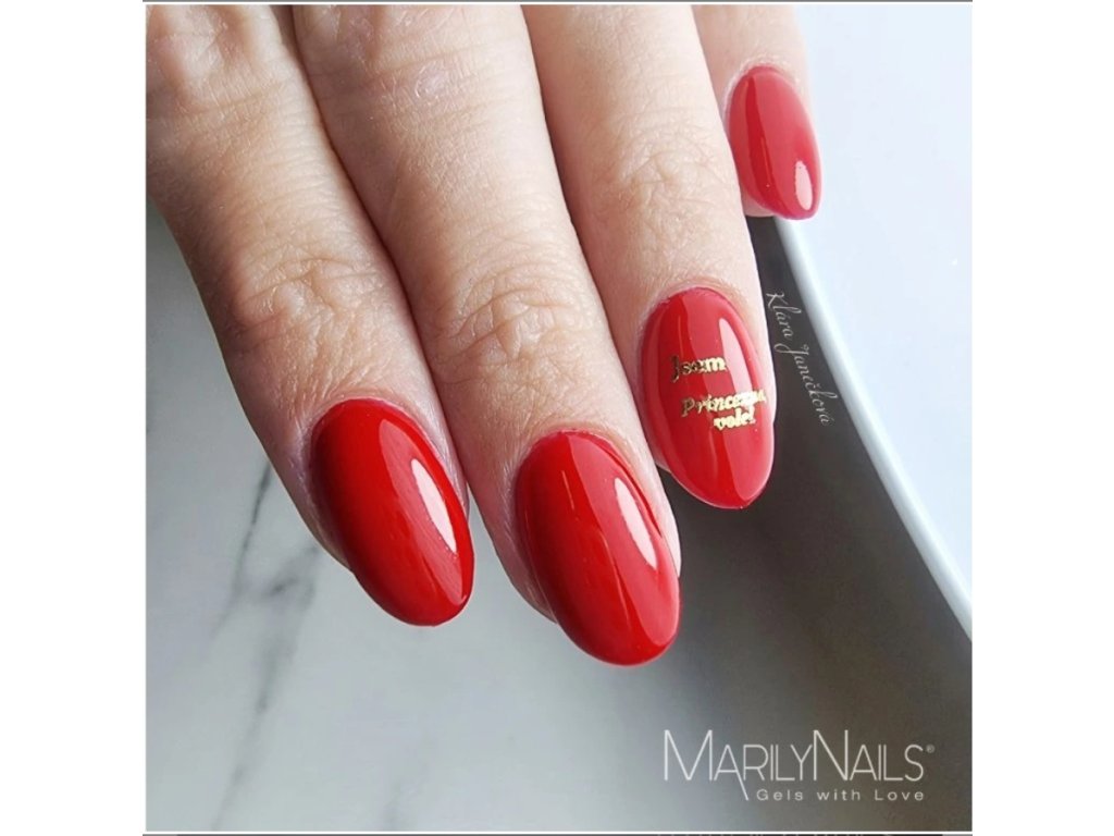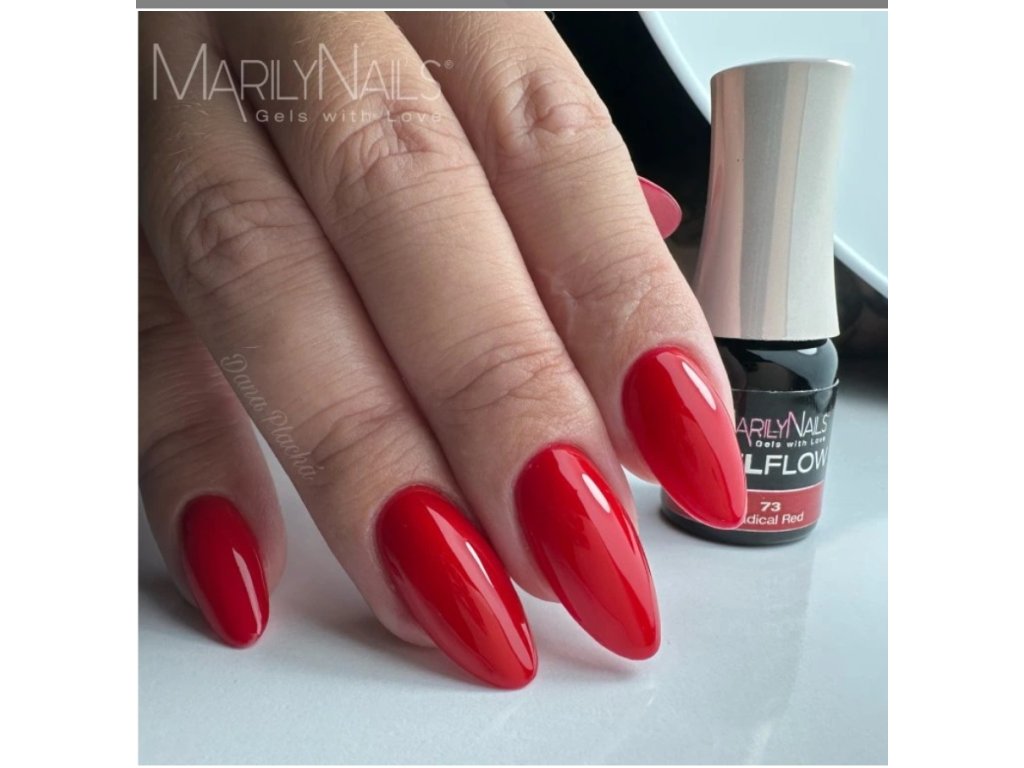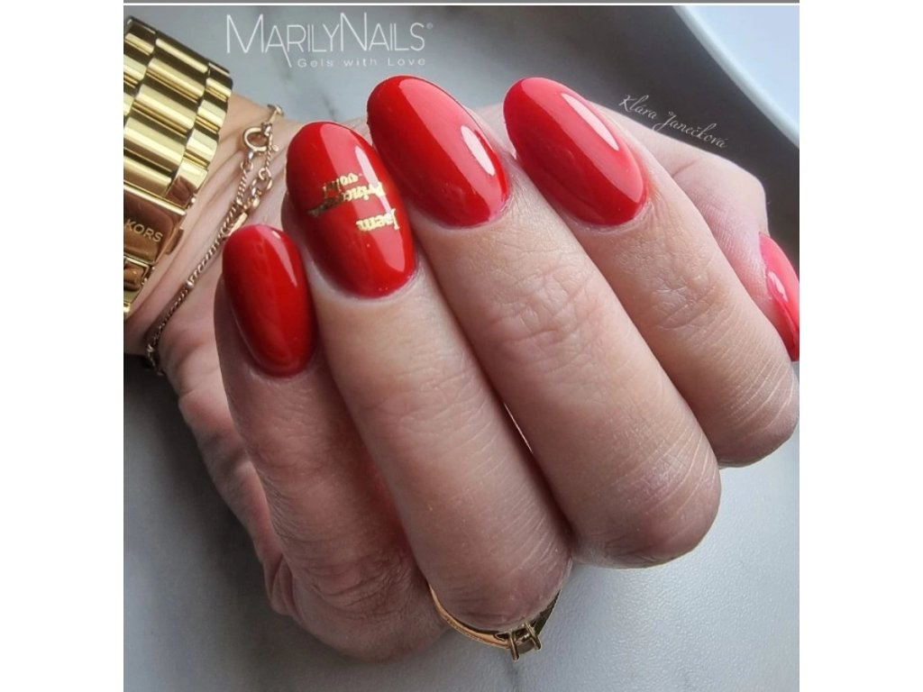 TIP: k perfektnímu nanesení okolo kutikuly si pomozte tenkým štětcem M0 od MarilyNails. Po vytvrzení aplikujte ve střední vrstvě lesk TopFlow Free (příp. Matt TopFlow Free).