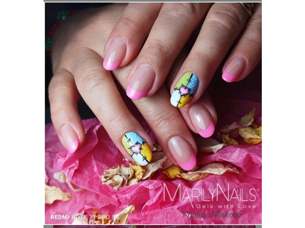 TIP: k perfektnímu nanesení okolo kutikuly si pomozte tenkým štětcem M0 od MarilyNails. Po vytvrzení aplikujte ve střední vrstvě lesk TopFlow Free (příp. Matt TopFlow Free).