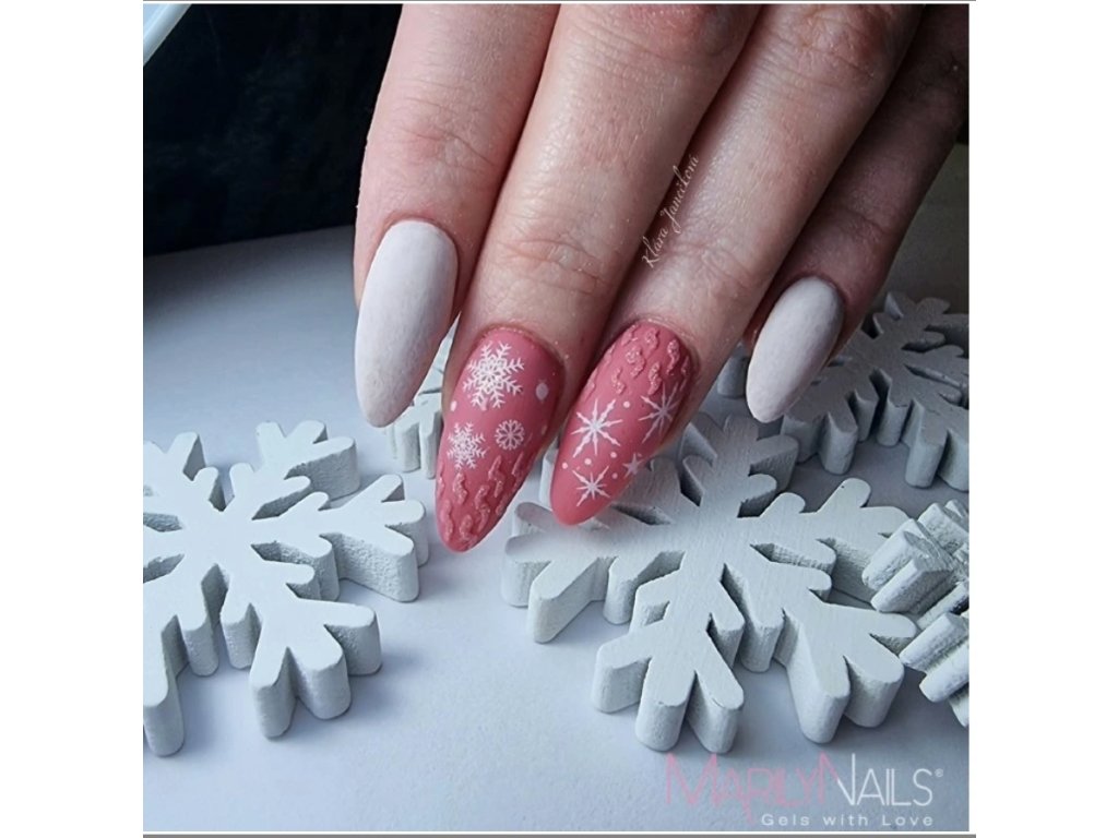 TIP: k perfektnímu nanesení okolo kutikuly si pomozte tenkým štětcem M0 od MarilyNails. Po vytvrzení aplikujte ve střední vrstvě lesk TopFlow Free (příp. Matt TopFlow Free).