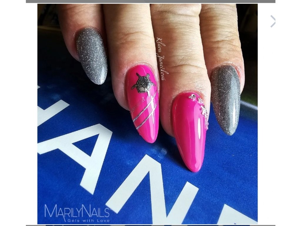 TIP: k perfektnímu nanesení okolo kutikuly si pomozte tenkým štětcem M0 od MarilyNails. Po vytvrzení aplikujte ve střední vrstvě lesk TopFlow Free (příp. Matt TopFlow Free).